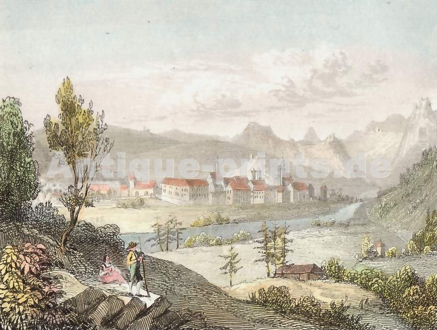 Écosse. Gravure sur acier, gravée par W. J. Edward. 1859. Légères salissures dans les marges. Bordure décorative. Aquarellée à la main. 12,5x9,5cm. Montée sous passe-partout.