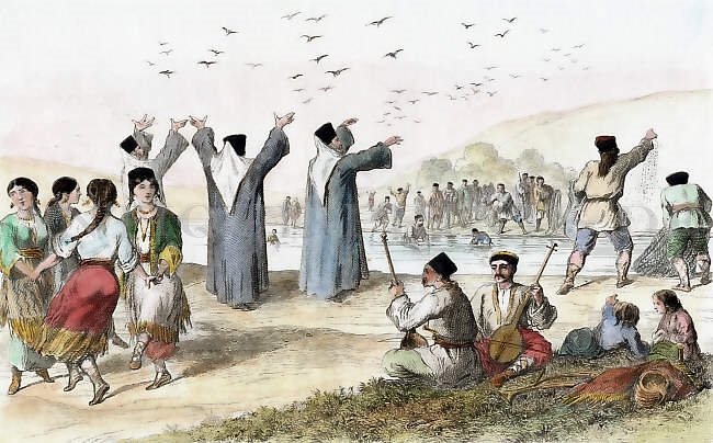 Pompeii. Original copper engraving, engraved by Cepparuli after Casanova. 1765. Very good condition. Printed on the reverse side. Hand-coloured (watercolour and gouache). 12,5x10cm. Matted.