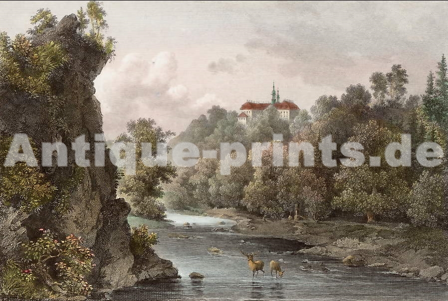 England. Stahlstich. ca 1850. Sehr guter Zustand. In gestochener Rankenbordüre. Handkoloriert. 17x12cm. Mit Passepartout.