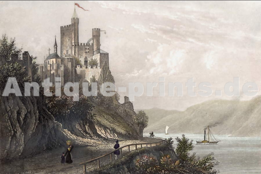 Germany. Original aquatint drawn by E. A. Teschmaker, engraved by Beker. Librairie de L.J Kirchberger à Ems. Rare. Decorative border. 1850. Small foxing spot in the left margin. Hand-coloured. 14x9cm. Matted.