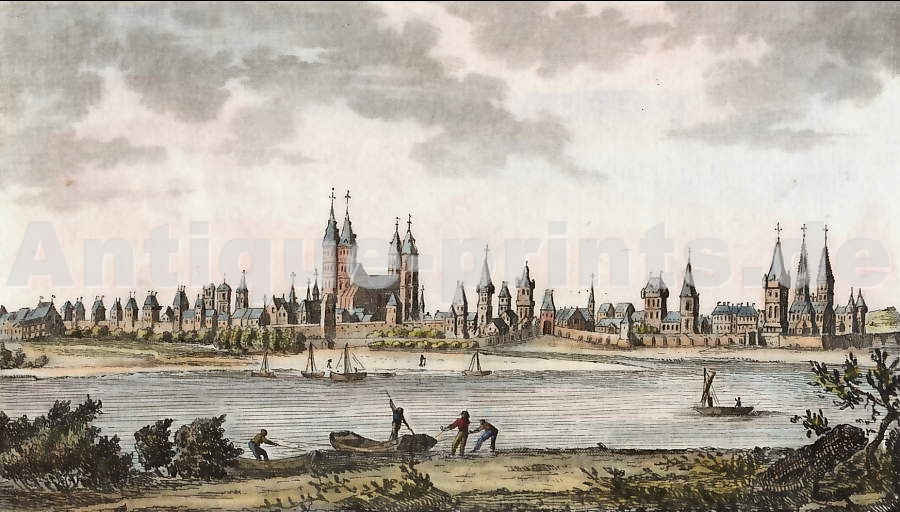 Germany. Original aquatint by J. J. Tanner. Librairie de L.J Kirchberger à Ems. Rare. Decorative border. 1850. Good condition. Hand-coloured. 14x9,5cm. Matted.