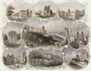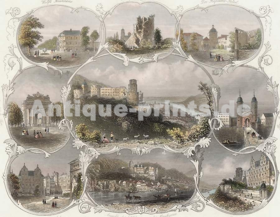 Print, Plates, Gravure, Engraving, Stich, Allemagne, Germany, Deutschland, Heidelberg, Wolfsbrunnen, Gesprengter Turm, Ruprechtspalast, Brückentor, Terrasse, Schloss von der Hirschgasse, Schlosshof und Karlstor