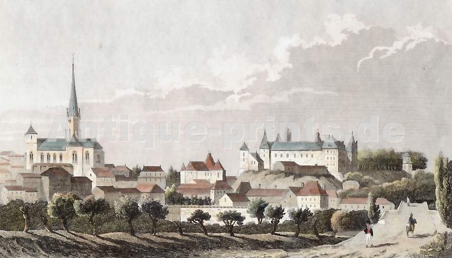 France. Gravure sur acier, gravée par A. Pugin d´après C. Heath. 1831. Légères rousseurs, sur Chine appliqué. Aquarellée à la main. 13x9cm. Montée sous passe-partout.