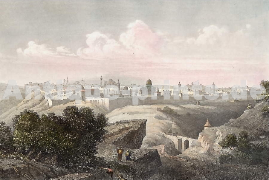Terre Sainte. Gravure sur acier, gravée par J. Outhwaite d´après A. Rouague. 1852. Très bon état. Aquarellée à la main. 17x12cm. Montée sous passe-partout.
