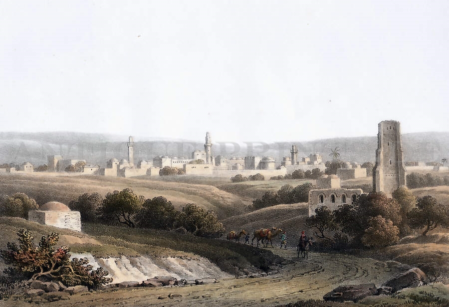 Terre Sainte. Lithographie en couleurs dessinée par J. M. Bernatz. 1855. Très bon état. Rehaussée à l´aquarelle. 16,5x11,5. Montée sous passe-partout.