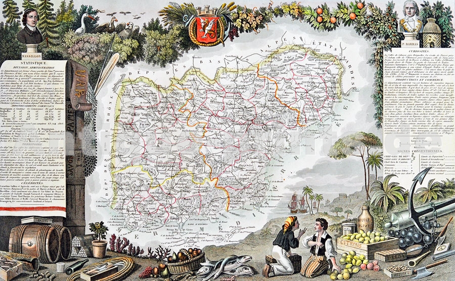 France. Original steel engraving drawn by A. Lacauchie, engraved by Rebel. 1849. Good condition. Hand-coloured. 16x10,5cm. Matted.