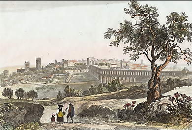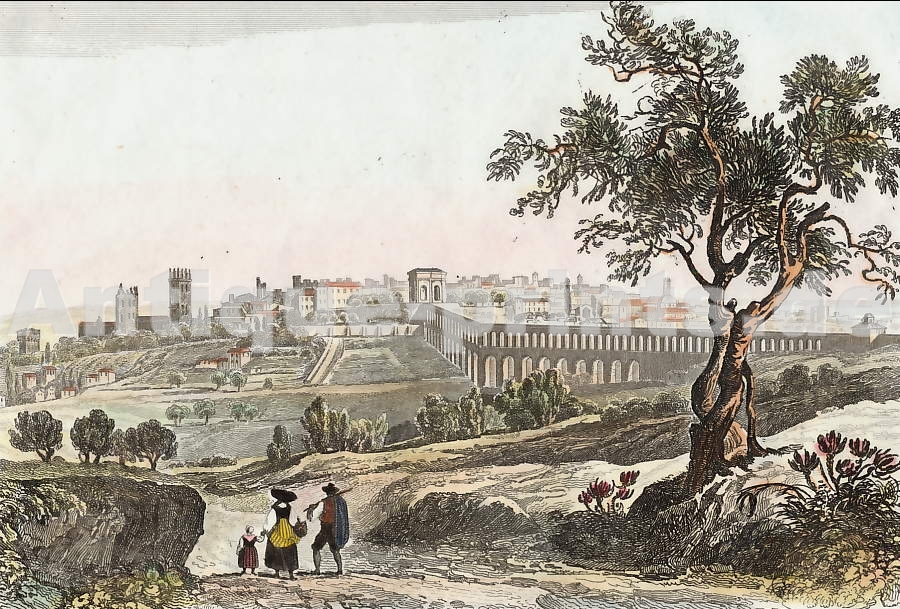 Italie. Gravure sur bois par L. Markaert. 1847. Légères salissures. Aquarellage d´origine. 16x10cm. Montée sous passe-partout.
