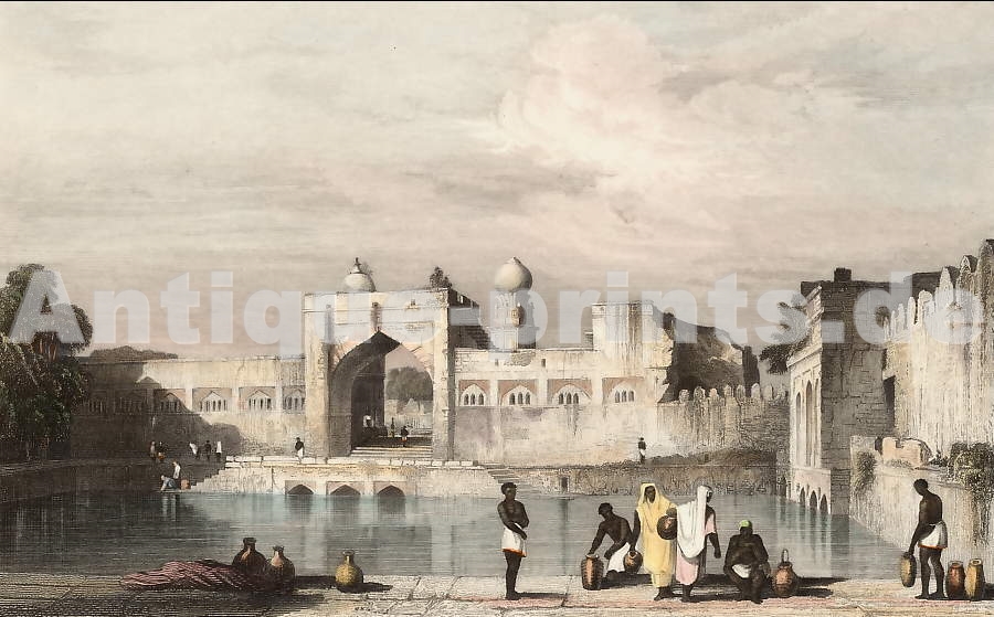 Holy Land. Original steel engraving, engraved by E. Finden after W. E. Fitzmaurice. 1836. Very good condition. Hand-coloured. 15x10cm. Matted.