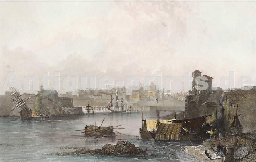 Malte. Gravure sur acier, gravée par J. Tingle d´après T. C. Dibden. 1840. Très bon état. Aquarellée à la main. 19x12,5cm. Montée sous passe-partout.