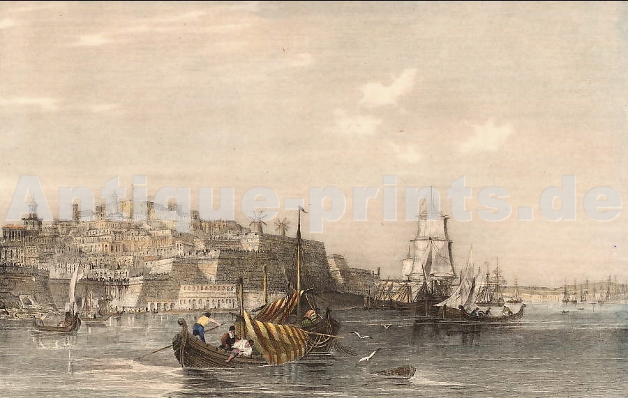 Malte. Gravure sur acier dessinée et gravée par H. Bibby. ca 1850. Très bon état. Bordure décorative. Aquarellée à la main. 18x12cm. Montée sous passe-partout.
