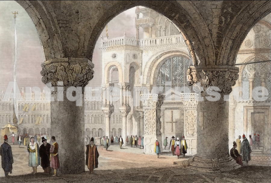 Italie. Gravure sur acier, dessinée et gravée par M. Kurz. 1846. Très bon état. Bordure décorative. Aquarellée à la main. 11x8cm. Montée sous passe-partout.
