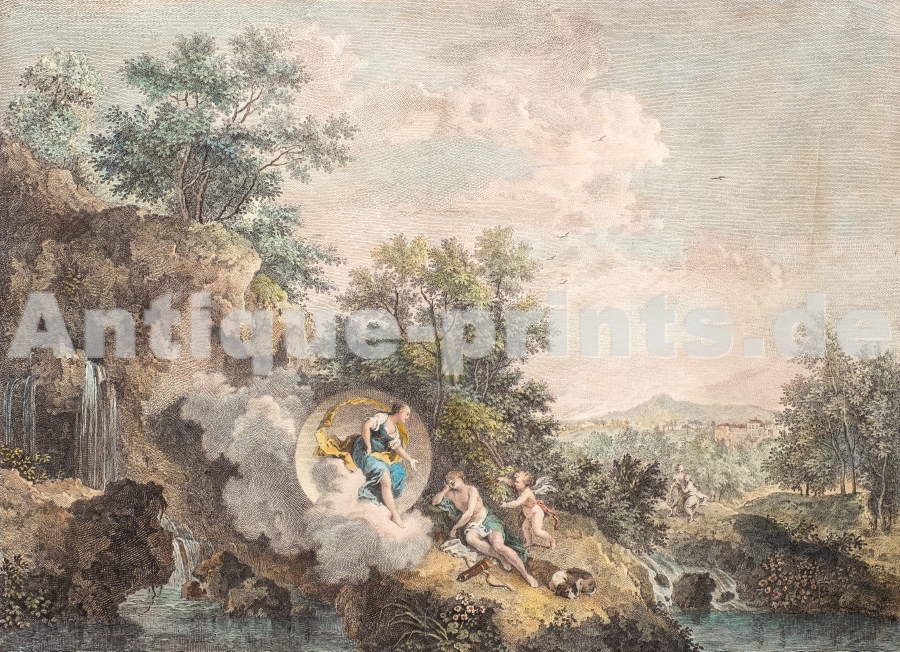 Mythology. Original copper engraving, engraved by F. Bartolozzi after F. Zuccarelli. 1762. Pasted on canvas, light creasing. Wear consistent with age and use. Hand-coloured. 52,5x38,5cm. Matted. DHL shipping only.