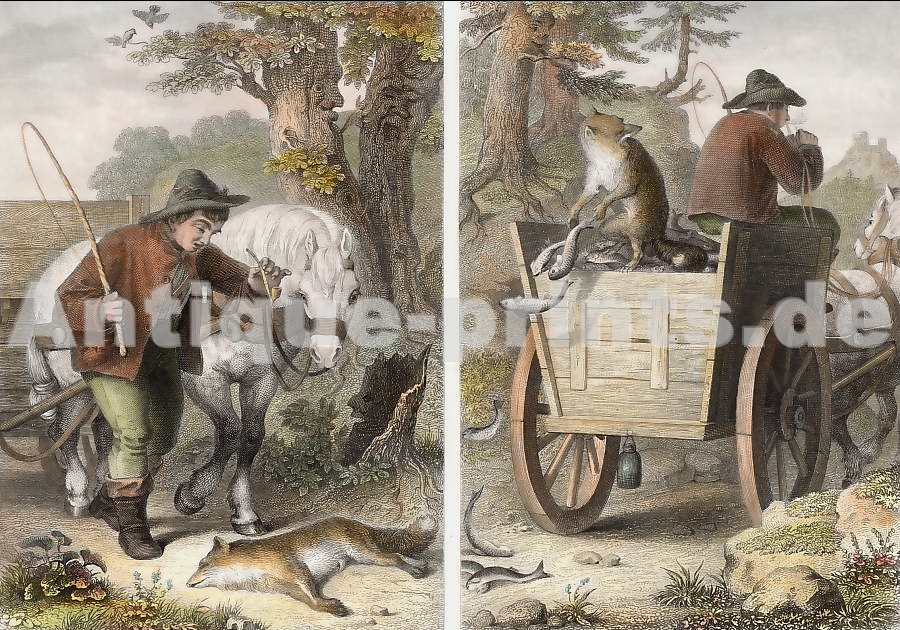 Le Roman de Renart. Gravure sur acier, gravée par W. French d´après H. Leutmann. 1852. Très bon état. Aquarellée à la main. 13,5x11cm. Montée sous passe-partout.