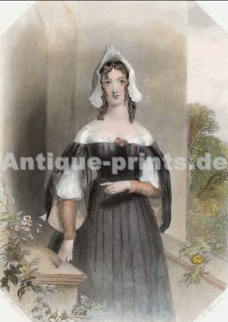 Shakespeare. Gravure sur acier, gravée par H. Cook d´après H. Meadows. 1838. Défaut sur la robe. Aquarellée à la main. 14x10cm. Montée sous passe-partout.