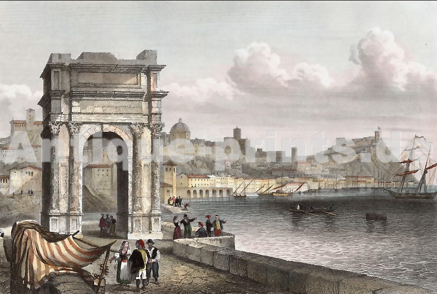 Herculaneum. Kupferstich von Nolli nach V. Campana. 1765. Leicht stockfleckig. Handkoloriert. 22x10cm. Mit Passepartout.
