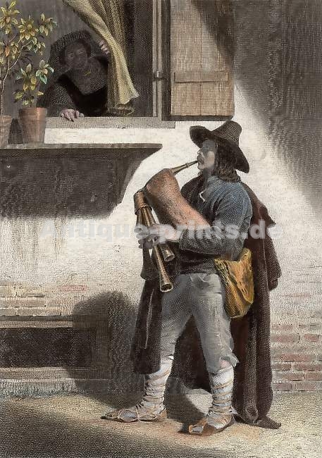 Italie. Aquatinte originale gravée par G. Giarré et Stanghi. 1833. Bon état. Aquarellage d´époque. 17,5x10cm. Montée sous passe-partout.
