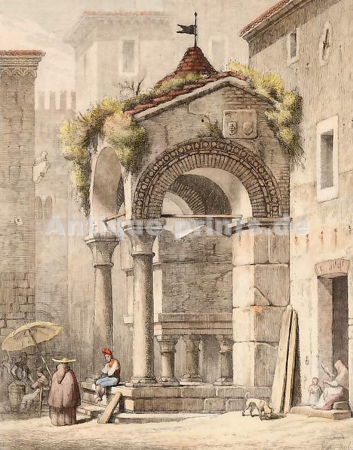 Italy. Original wood engraving drawn by Grandsire, engraved by Laplante. 1886. Very good condition. Modern hand-colouring. 15,5x11cm. Matted.