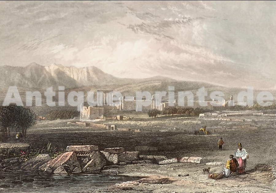 Jordanie. Gravure sur acier, gravée par E. Finden d´après J. D. Harding. 1836. Très bon état. Aquarellée à la main. 15x10cm. Montée sous passe-partout.