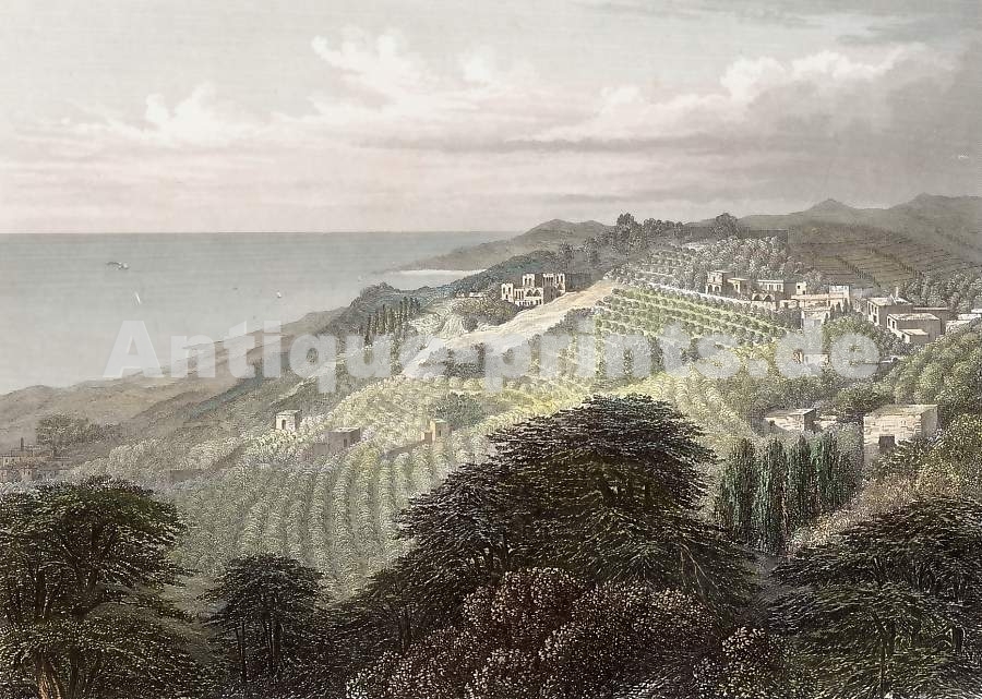 Inde. Gravure sur acier, gravée par R. Brandard d´après W. Daniell. 1836. Sans titre. Grosse tache dans la marge gauche. Aquarellée à la main. 14,5x10cm. Montée sous passe-partout.