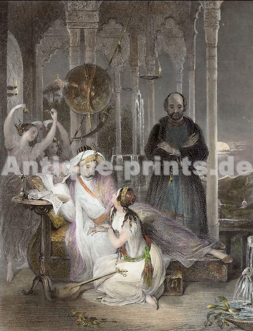 Spain. Original wood engraving, engraved by J. W. Parker after W. Heath. 1835. Very good condition. Printed on the reverse side. Hand-coloured. 13x9cm. Matted.