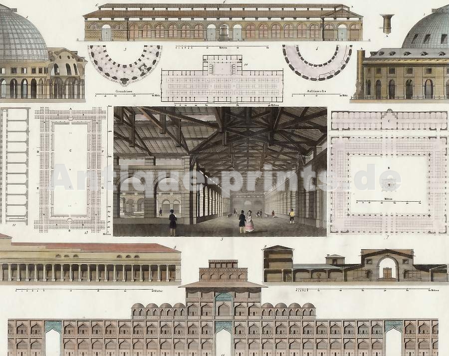 1-4. Grain Hall in Paris, 5-7. Market of St Germain in Paris, 8. The Market at Pavia, 9-10. The Magdalene Market in Paris, 11. Plan of the Market in Pavia, 12-13. The Almeidan at Ispahan.