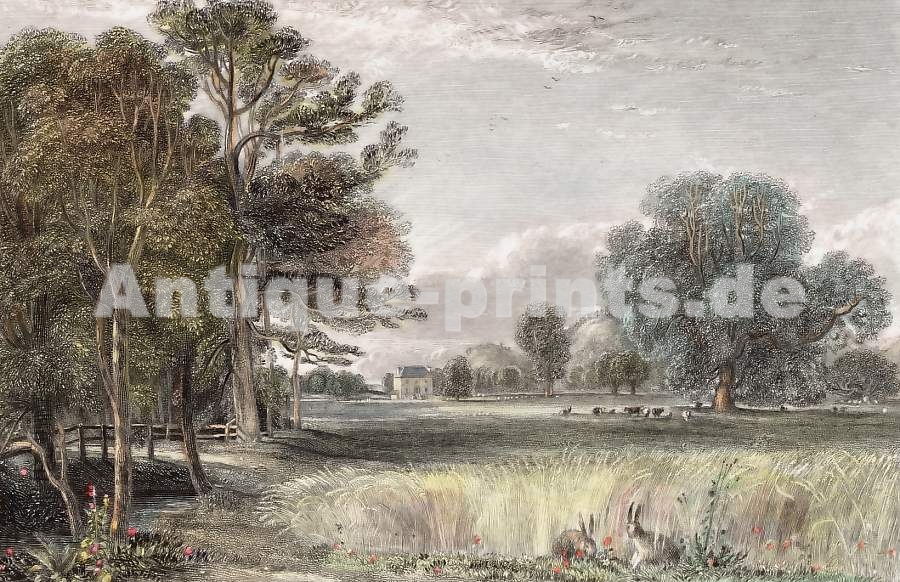 England. Original steel engraving, engraved by M. J. Starling after T. Allom. 1834. Very good condition. Hand-coloured. 15x9,5cm. Matted.