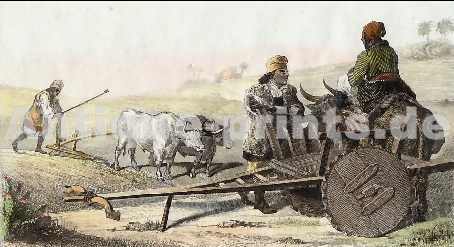 Sicily. Original wood engraving by Clerget. 1879. Very good condition. Printed on the reverse side. Hand-coloured. 24x16cm. Matted.