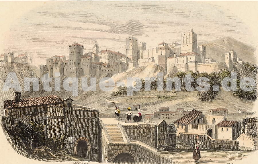 Espagne. Gravure sur acier dessinée et gravée par A. et E. Rouargue. 1851. Légères rousseurs dans les marges. Aquarellage d´époque. 17x12cm. Montée sous passe-partout.