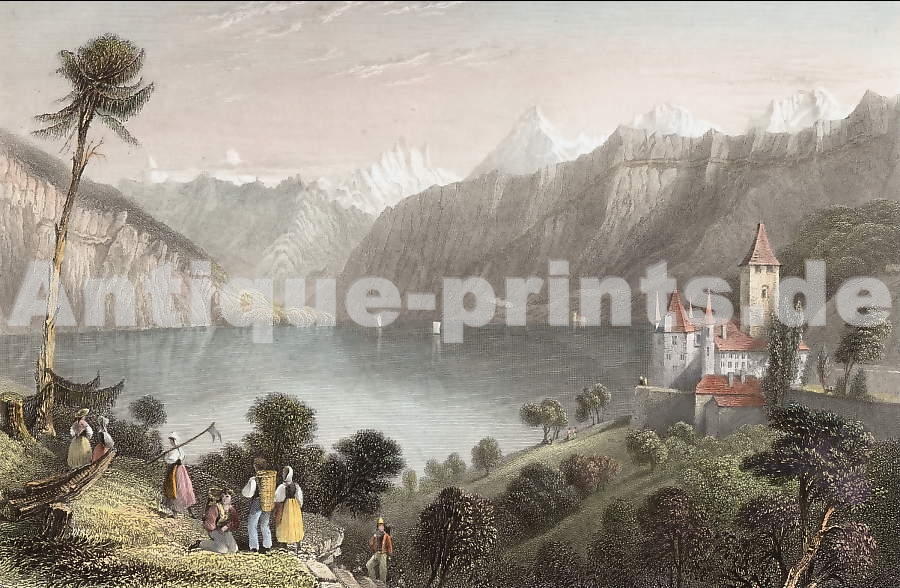 Suisse, Schweiz, Gravure, Switzerland, Stich, Swiss, Engraving, Thun, Thün, Castle of Spiez, Château De Spiez, Schloss Spiez