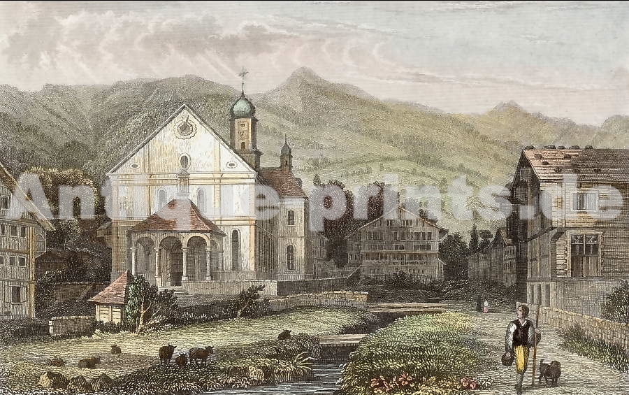 Suisse. Gravure sur acier, gravée par W. Wallis d´après W. H. Bartlett. 1834. Légères rousseurs dans la marge inférieure. Aquarellée à la main. 17,5x11,5cm. Montée sous passe-partout.