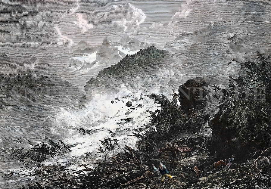 Suisse. Gravure sur bois gravée par Whymper. 1878. Très bon état. Texte au verso. Aquarellée à la main. 23x16cm. Montée sous passe-partout.