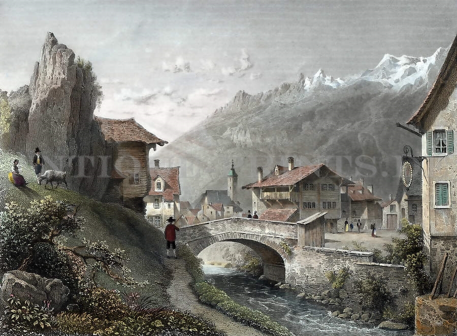 Switzerland. Original steel engraving engraved by Heawood after Rosal. 1853. Very good condition. Hand-coloured. 18x13,5cm. Mounted.