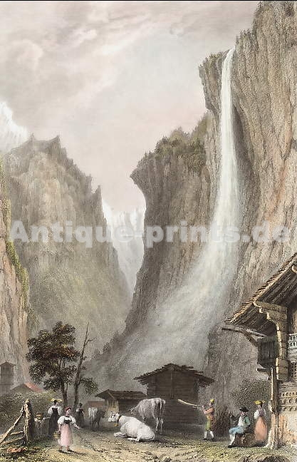Switzerland. Original steel engraving, engraved by A. H. Payne. ca 1850. Good condition. Decorative border. Hand-coloured. 15x9,5cm. Matted.
