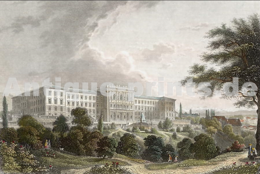 Portugal. Original steel engraving, engraved by E. Finden after C. Stanfield. 1837. Good condition, brown line in the right margin. Hand coloured. 14x9,5cm. Matted.