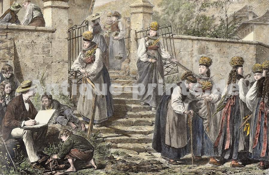 Germany. Original lithograph, engraved by L. Marvy and C. Masson after Tony Johannot. 1847. Very good condition. Hand-coloured. 18,5x11cm. Matted.