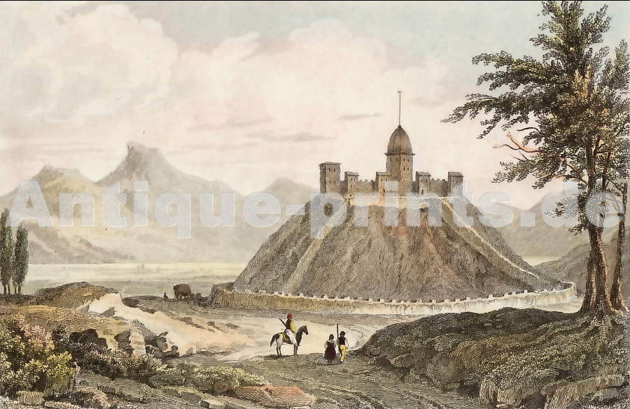 India. Original steel engraving, engraved by S. Fisher after H. Warren. 1839. Very good condition. Hand-coloured. 14,5x9,5cm. Matted.