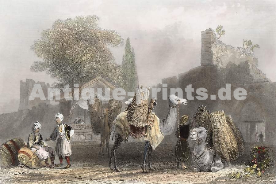 Grèce. Gravure sur acier, gravée par M. J. Starling d´après W. H. Bartlett. 1838. Bon état. Aquarellée à la main. 19x12,5cm. Montée sous passe-partout.