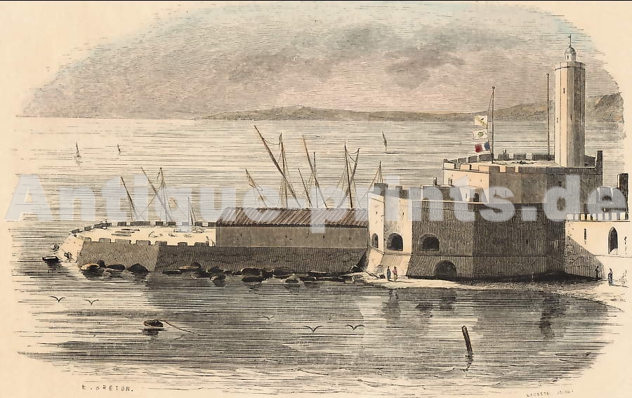 Algeria. Original wood engraving, engraved by Lacoste after E. Breton. 1846. Very good condition. Hand-coloured. 16x10cm. Matted.