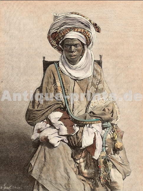Soudan. Gravure sur bois, gravée par Hildibrand d´après Benoist. 1885. Rousseurs dans la marge inférieure. Aquarellée à la main. 18,5x12,5cm. Montée sous passe-partout.