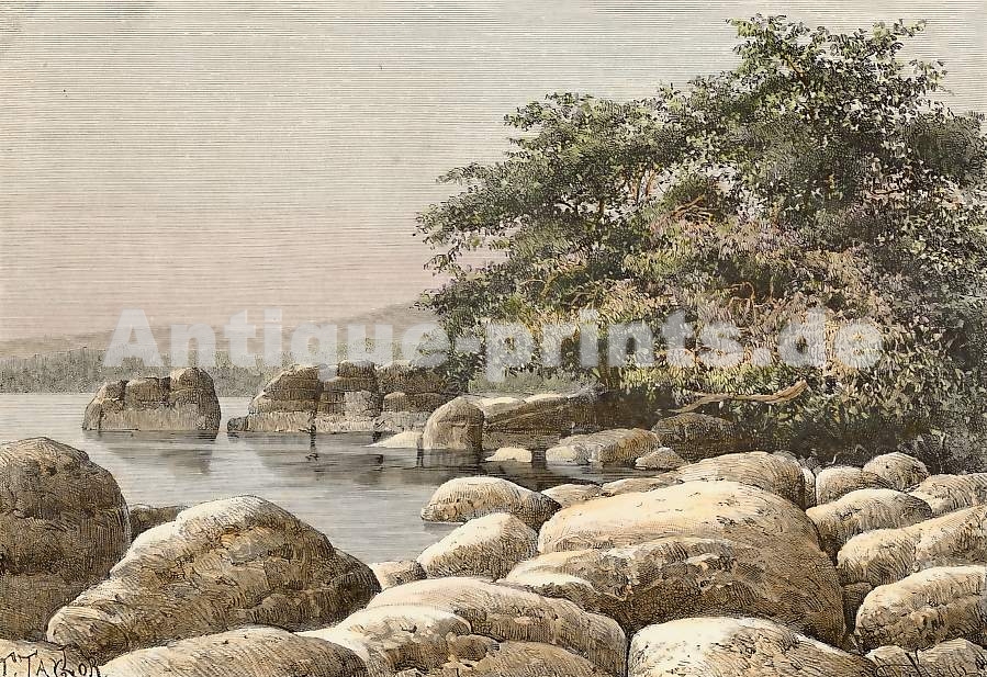 Uganda. Original wood engraving, in texte, printed on the reverse side. 1887. Very good condition. Hand-coloured. 15x12cm. Matted.