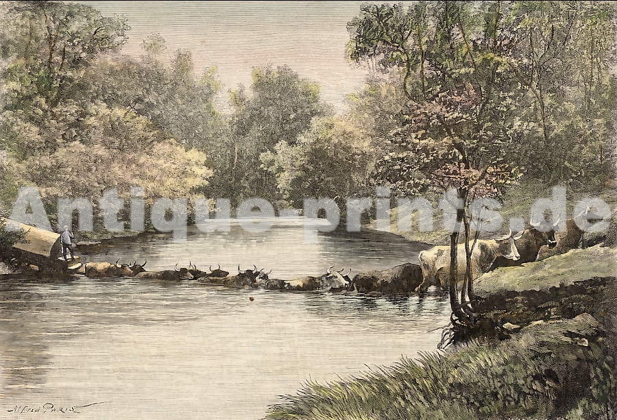 Varia. Original steel engraving engraved by Koch after Brochart. 1853. Slightly soiled in the lower margin. Hand-coloured. 14x11cm. Mounted.