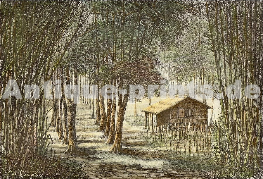 Mozambique. Gravure sur bois, gravée par A. Kohl d´après Riou. 1888. Légères rousseurs dans les marges. Aquarellée à la main. 19x13cm. Montée sous passe-partout.