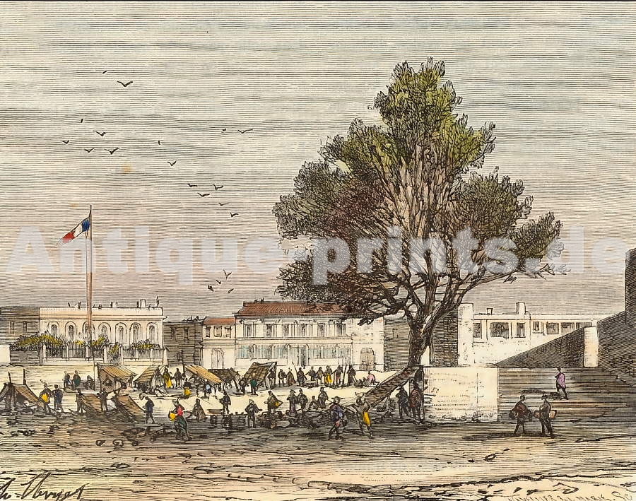 Congo. Gravure sur bois, gravée par Bertrand d´après P. Langlois. 1888. Légères rousseurs dans les marges. Aquarellée à la main. 19x13cm. Montée sous passe-partout.