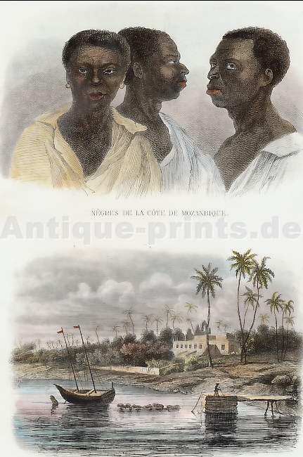 Congo et Kenya. Gravure sur bois. 1844. Léger jaunissement du papier. Aquarellage d´époque. 16x12,5cm. Montée sous passe-partout.