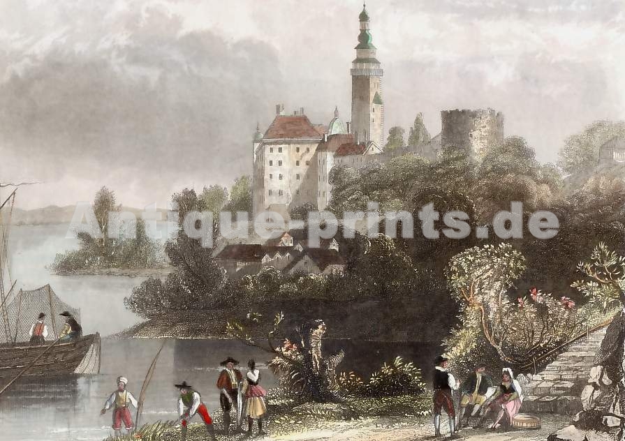 Autriche. Gravure sur acier, gravée par F. Zahn. ca 1850. Bon état. Aquarellée à la main. Bordure décorative. 23,5x14,5cm. Montée sous passe-partout.