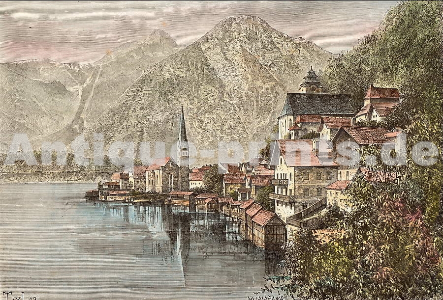 Autriche. Gravure sur bois, gravée par Whitehead d´après K. Girardet. 1863. Rousseur dans la marge inférieure. Aquarellée à la main. 15,5x10cm. Montée sous passe-partout.