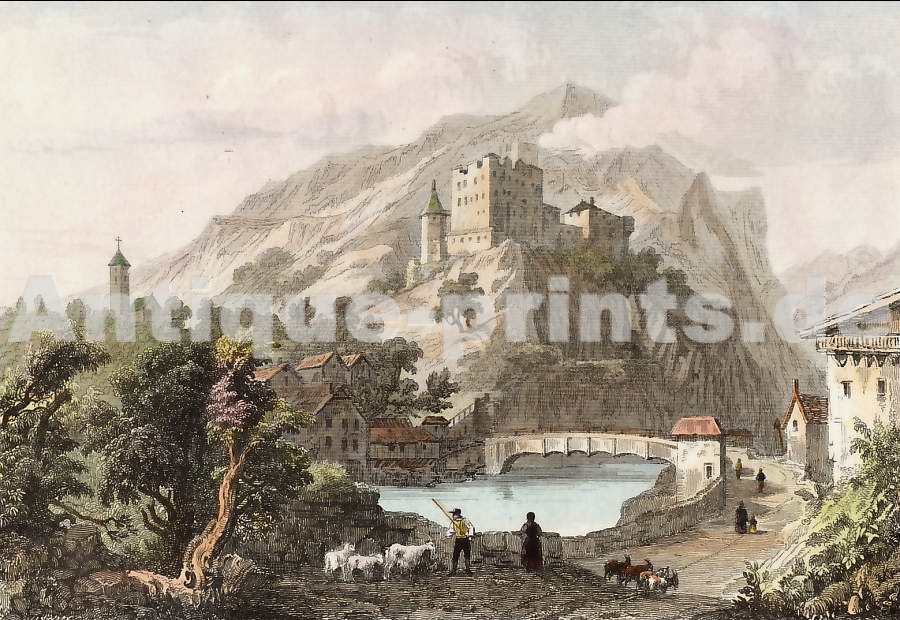 Austria. Original steel engraving, drawn by W. H. Bartlett, engraved by J. Cousen. 1842. Good condition. Hand-coloured. 18,5x11,5cm. Matted.