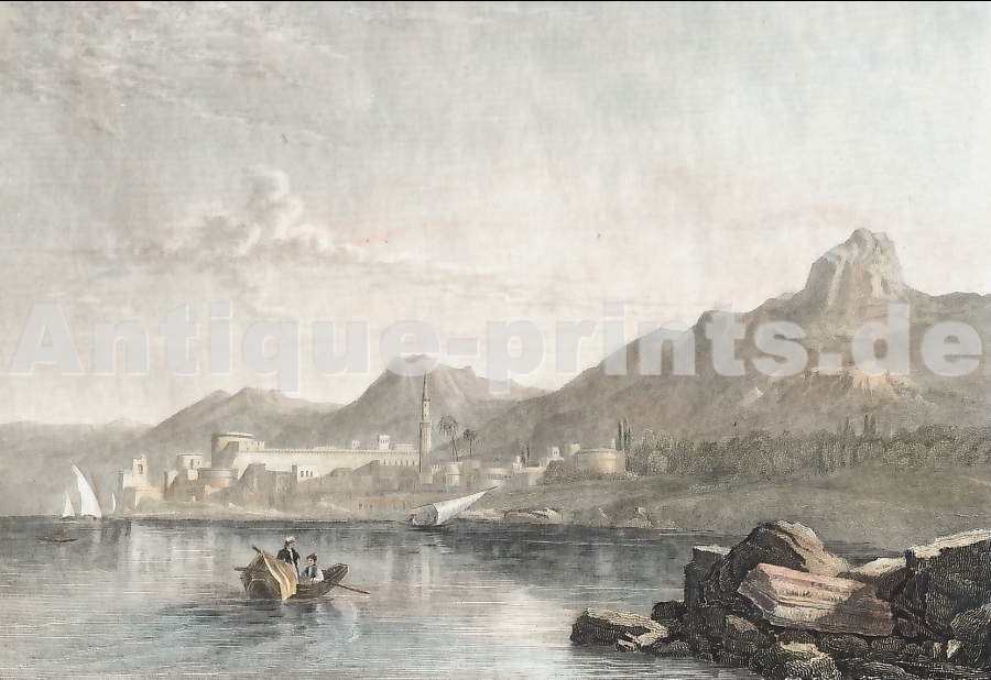 Greece. Original wood engraving, engraved by C. Barbant after T. Taylor. 1878. Foxing in the link margin. Hand-coloured. 19x13cm. Matted.