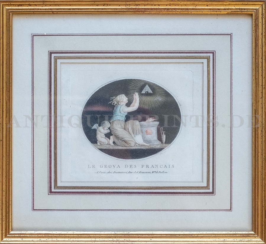 Franc-maçonnerie. Gravure au pointillé imprimée en couleur de B-L. Prévost. 1793. Très bon état. 11x11cm. Avec cadre*: 29x26,5cm. Envoi par DHL uniquement.
