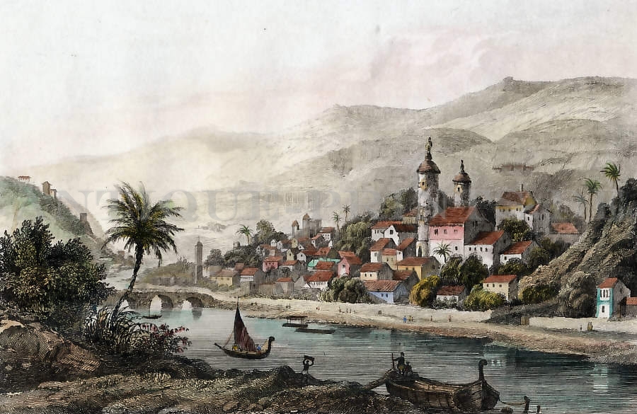 Brazil. Original steel engraving, engraved by François Hippolyte Lalaisse after Vanderburch. 1838. Very good condition. Hand-coloured. 14x9cm. Matted.